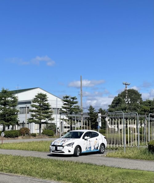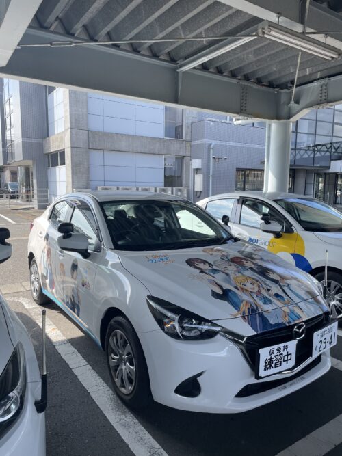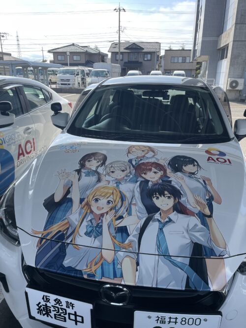 ラッピング教習車を導入して、作品と福井県を応援しています。